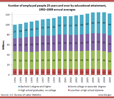 But has the intrinsic value of a Bachelor’s degree risen by a similar value over that time? Probably not. You can make several solid arguments that if anything, the value of a Bachelor’s degree is less than it was when I graduated in 1989. First, there’s the sheer number of college graduates now in the work force. In 1992, BLS estimated there were 27 million college graduates, comprising about 25% of the work force. (See chart to the left).By 2009, that number reached 44 million, comprising 36% of the work force. And for our 2017 graduate, those figures are estimated to be 58 million and 45%. Where once a Bachelor’s degree separated you from the rest of your age group (and therefore put you near the head of the pack for advancement, promotion and salary), by 2009 there were more people sporting a Bachelor’s degree than people with only a high school diploma in the workforce. The BA or BS after your name has become what the high school diploma was a generation ago: a sign of basic academic achievement.
