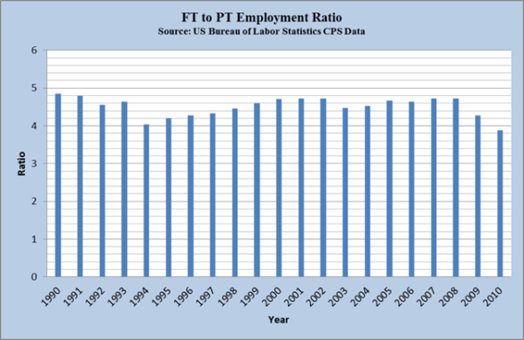 Notice that the percentage of working age people now working has dropped and kept dropping like a stone, despite all of that spending. In fact, the last time this few people had jobs was in 1982 – and prior to that, 1956, when farm payrolls were significantly higher than they are now. Now for the second half of the equation, part time employment vs. full time: