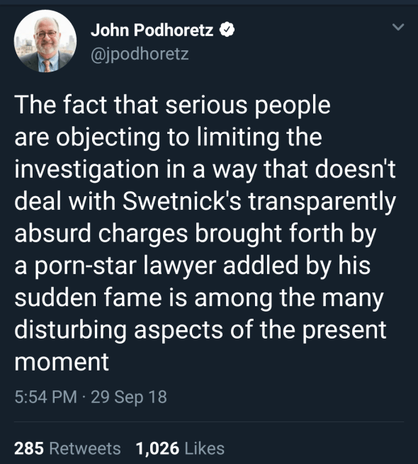 When I saw this tweet the other night, it got the ol’ gears a-turnin’, as my grandfather would say. John Podhoretz was making a point about one particularly one decidedly unserious lawyer promoting a seriously insincere story based on an even more insincere allegation. It’s the kind of nonsense that never would have seen the light of day, other than on some anonymously written blog, not that long ago.