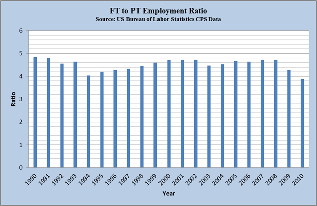 Second, the unemployment rate was once a solid indicator of the number of Americans who were, well, unemployed. But in 2003, the BLS changed the definition of an unemployed person from somebody who wasn’t working, but eligible to work, to somebody who was out of work and actively seeking employment. Seems like a subtle difference, but in today’s job market it’s proving to be very consequential. Additionally, BLS never counted part-time employees as “fully employed” until 2011 (funny how that date keeps coming back, more on that later, too). In the current BLS reports, all part-time employees are counted as fully employed, even if the employee would rather work full-time but can’t because their employer isn’t offering them full hours. So, that %.3% looks pretty good. It is certainly within historical norms, until you recognize that the old methodology used to get that number was much more restrictive – and accurate – than the current one.